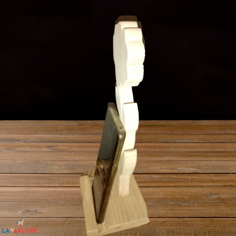 Support de téléphone fabriqué entièrement en hêtre naturel en forme de fleur. Dimensions : 26 cm de haut, socle : 10 cm X 9 cm. Poids : 160 grammes.