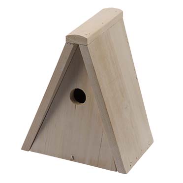 Nichoir en pointe. Avec crochet de suspension. Dimension : 20 cm x 15 cm x 25 cm. Poids : 650 grammes.