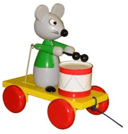 La souris est un jouet à tirer qui va ravir votre enfant. La souris joue du tambour pour votre enfant. Sur un char à quatre roues, elle suit le rythme et frappe sur l’instrument avec les deux baguettes rattachées à ses bras.