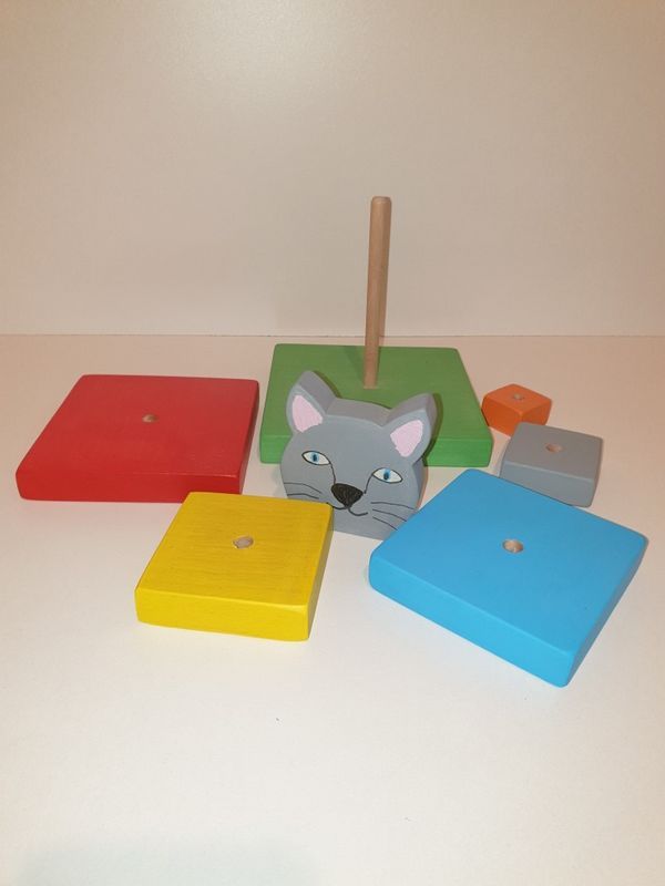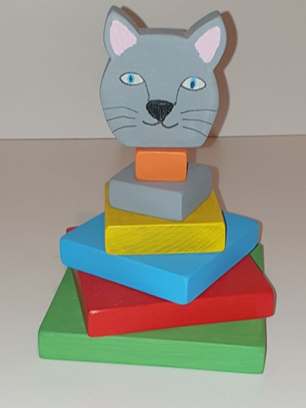 Jouet en bois en forme de chat, mais d’une constitution assez particulière. En effet, il s’agit d’un jouet empilable entièrement en bois dont la tête est en forme de chat et le reste du corps en pyramide.