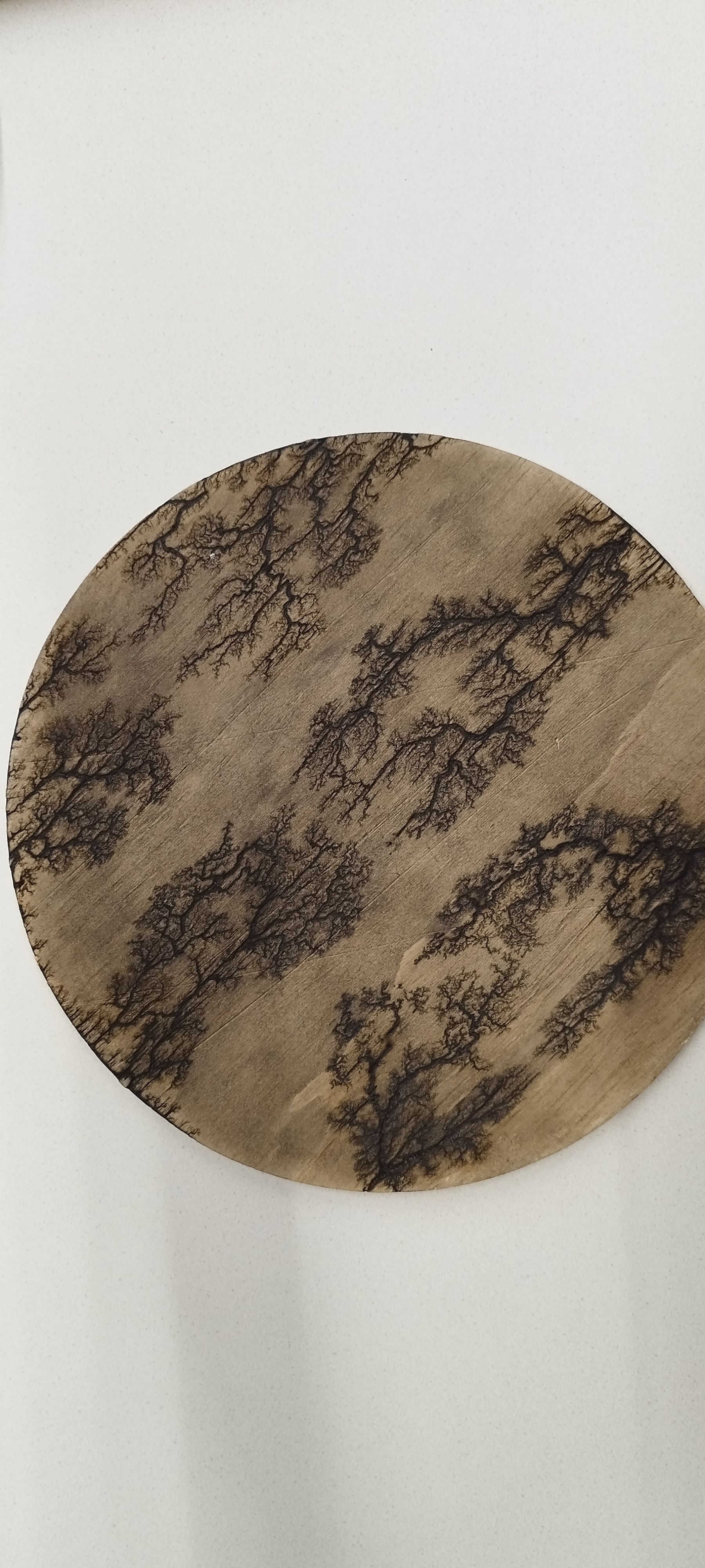 Dessous de plat en contreplaqué, gravé à l'arc électrique, poncé et verni à la main, diamètre 30 cm