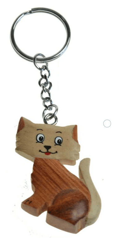Ce porte clef "chat assis", fabriqué en marquèterie avec plusieurs sortes de bois, est un objet décoratif et utile pour ne pas perdre vos clefs