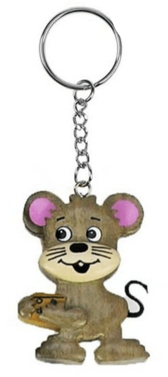 Ce porte-clés "souris", en marqueterie, fabriqué de différentes sortes de bois, est un objet décoratif et utile pour ne pas perdre vos clés.
