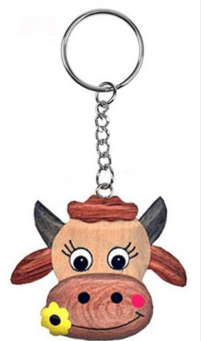 Ce porte clef , tête de vache avec une fleur au coin de la bouche , en marqueterie , fabriqué de différentes sortes de bois, est un objet décoratif et utile pour ne pas perdre vos clefs .