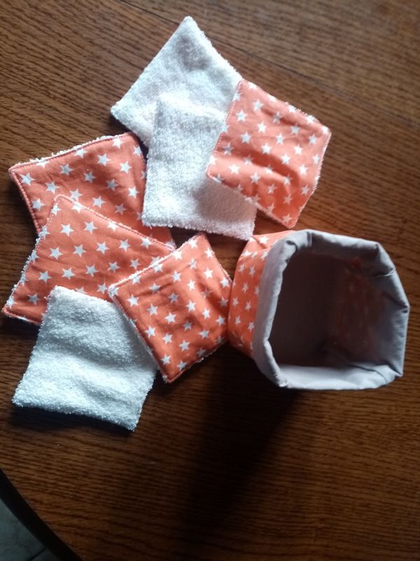 Panier de rangement accompagné de 7 lingettes lavables et réutilisables à l'infinie, mesurant 10 cm de côté.