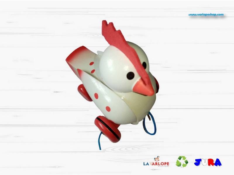 Poule à tirer en bois qui bouge la tête et les ailes en caquetant quand on la tire, à l'aide d'une ficelle. Ce jouet à tirer fait le bonheur des plus petits.